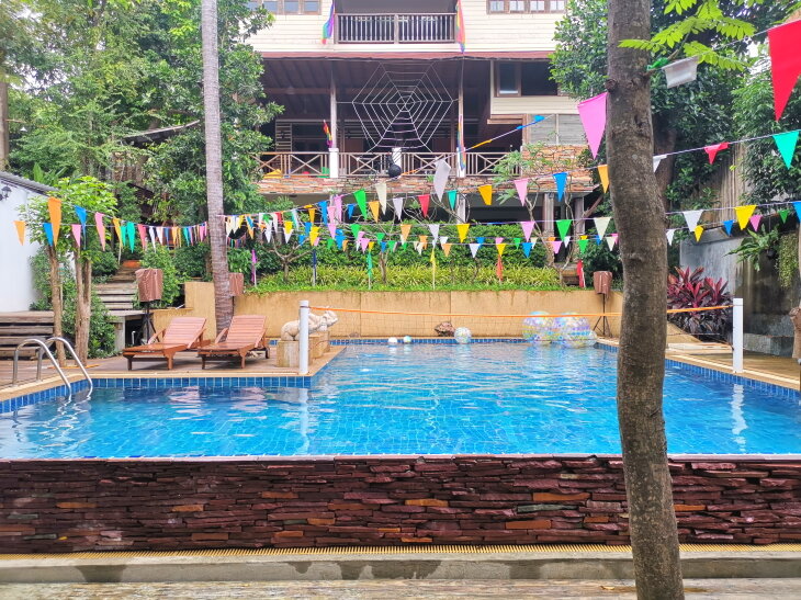 Itโs in Chaweng beach area and about 10 minutes from the center where you can find several bars, beach clubs, restaurants and shops. The resort is for men only and has large rooms or villas, several outdoor spaces, an excellent swimming pool supported by a bar. The bar can be attended by non-guests and we are entitled to participate in several pool parties organized by the resort. It is also the best way to meet other tourists.