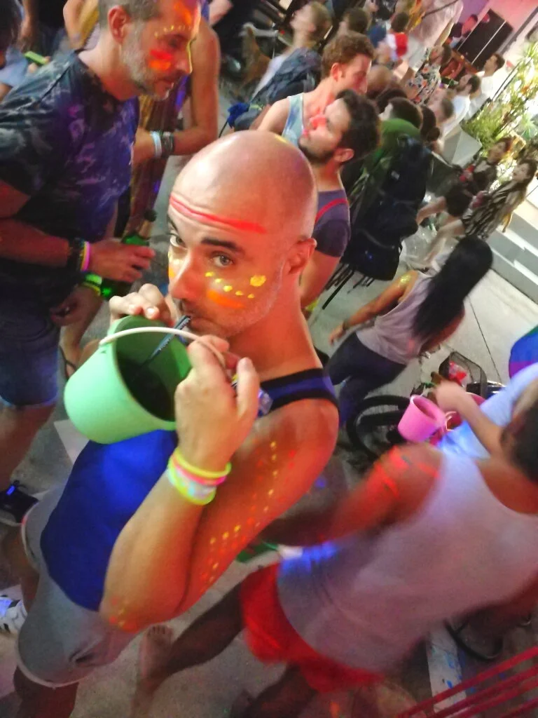 There are people who go on purpose from all over the world to the party. Itโs held when thereโs a full moon, it has a crowd of people dressed or not in fluorescent colors, body painting, lots of music washed down with a lot of alcohol all by the water on the beach.